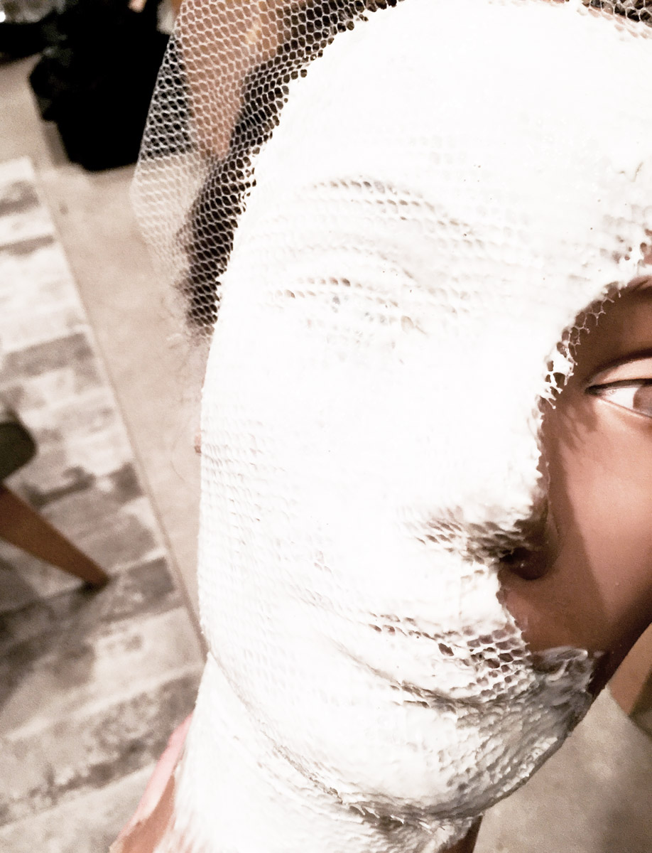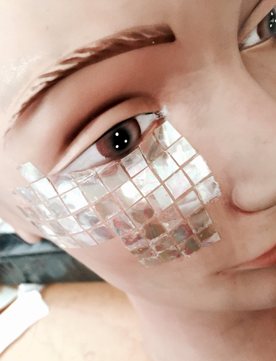 What you see above is two layers of liquid latex applied directly to my mannequin’s clean face. Followed with a piece of tulle and another two layers of liquid latex. Each layer is allowed to dry. You know it’s dry when it isn’t white and you can see through it. I then peeled away my mask to ensure I didn’t disturb my mosaic after it was applied.