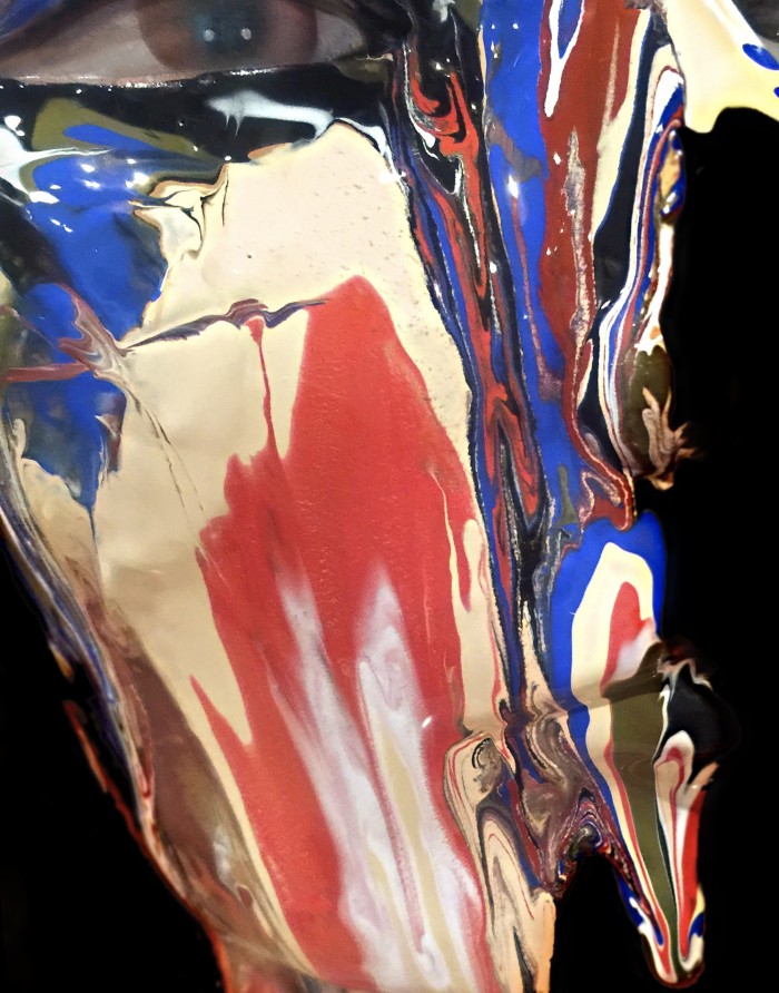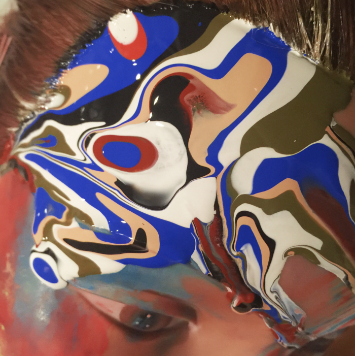 I began at the top of the forehead in the upper right recession.  Black liquid airbrush makeup was dropped onto the face first and was followed with multiple shades and repeated over and over again.  The more color you add; the more the paint travels creating the marbled effect.  makeup
