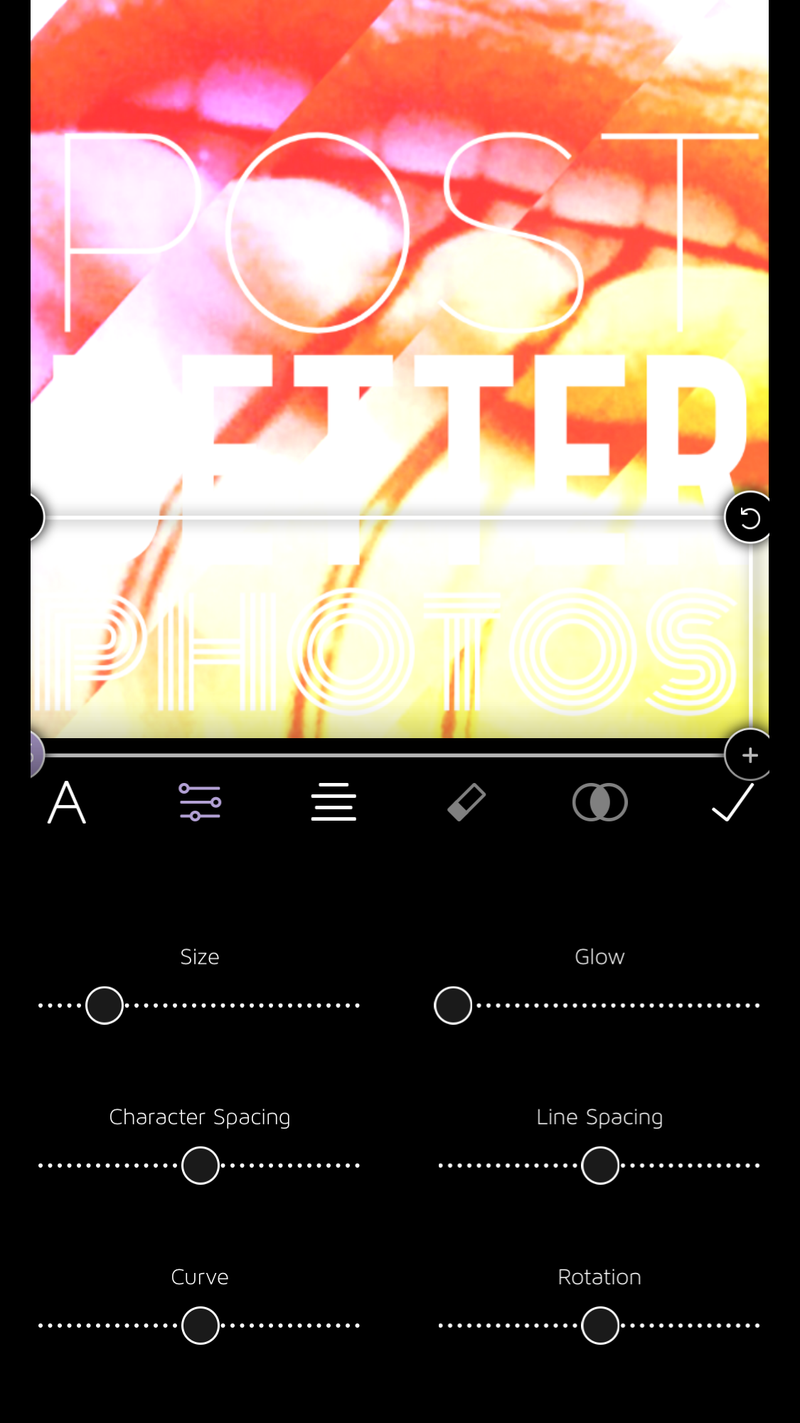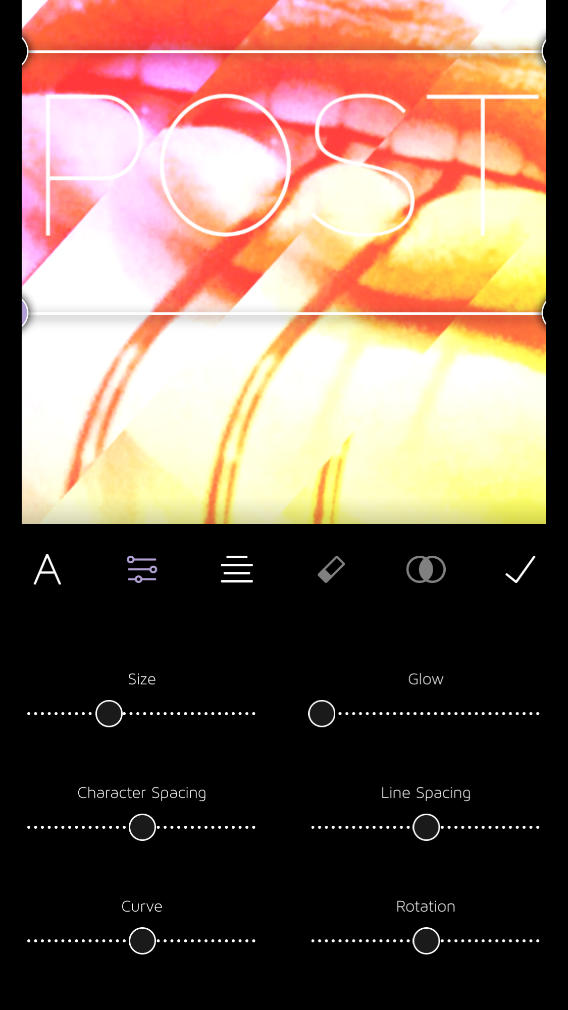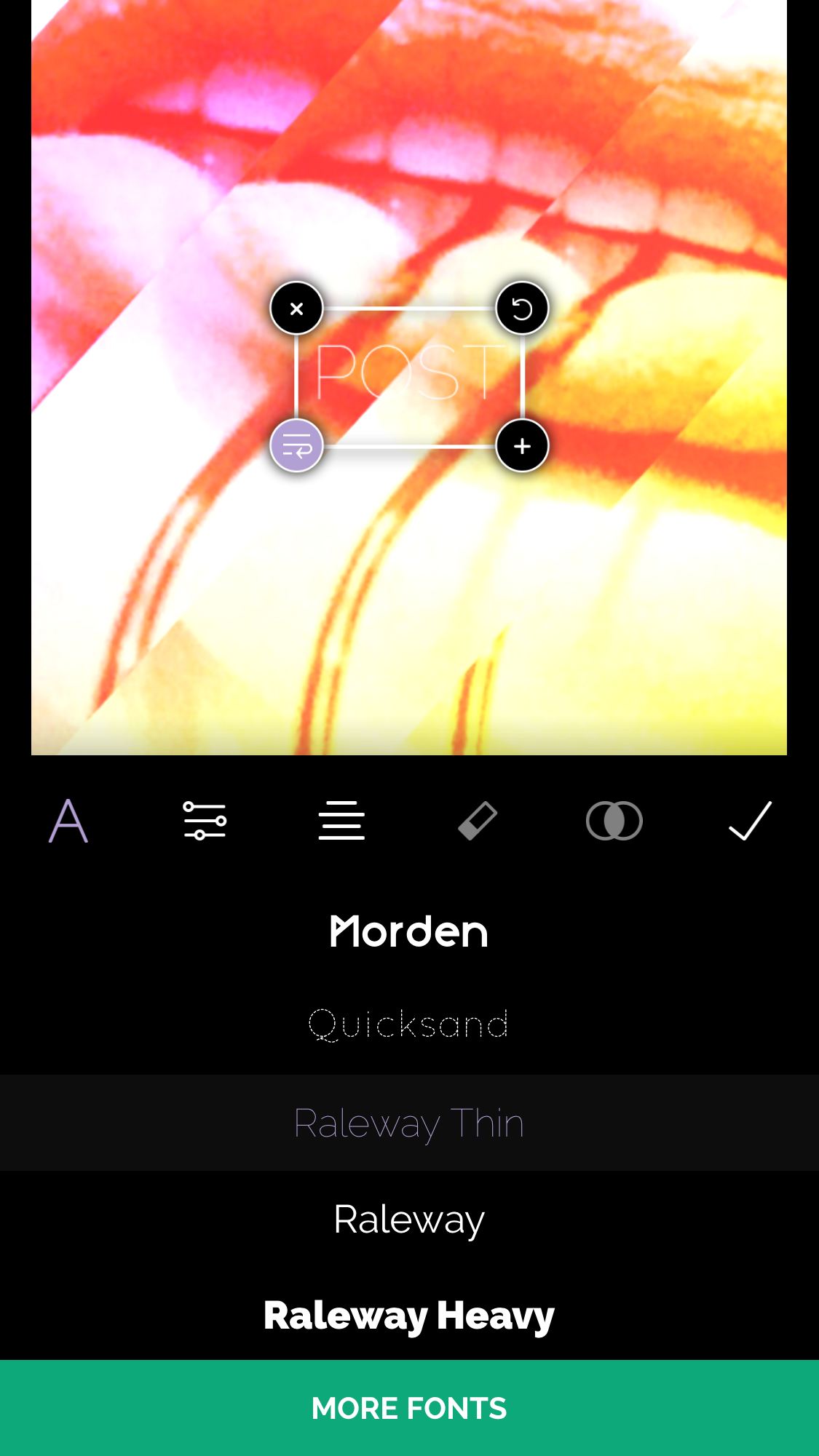 Many of you may stop there, but for education purposes I want to share with you an app I just found.  FONT CANDY is used if you want to add words to your images.  You can simply use one font or add multiple fonts to your photo.  I opened my saved photo into FONT CANDY to add the final touches.  I used three different fonts making it necessary to use three font boxes.  Each text box has many options including font, size, character spacing, text curve, etc.  Once you have your text the size and orientation you LOVE, click the circle at the top of the screen to alter the text color and mask color.  I opted to make the mask color black and decrease the opacity to reveal my final effect.  Click the save button in the top right hand corner of the app to save to your camera roll or post directly to INSTAGRAM or FACEBOOK.