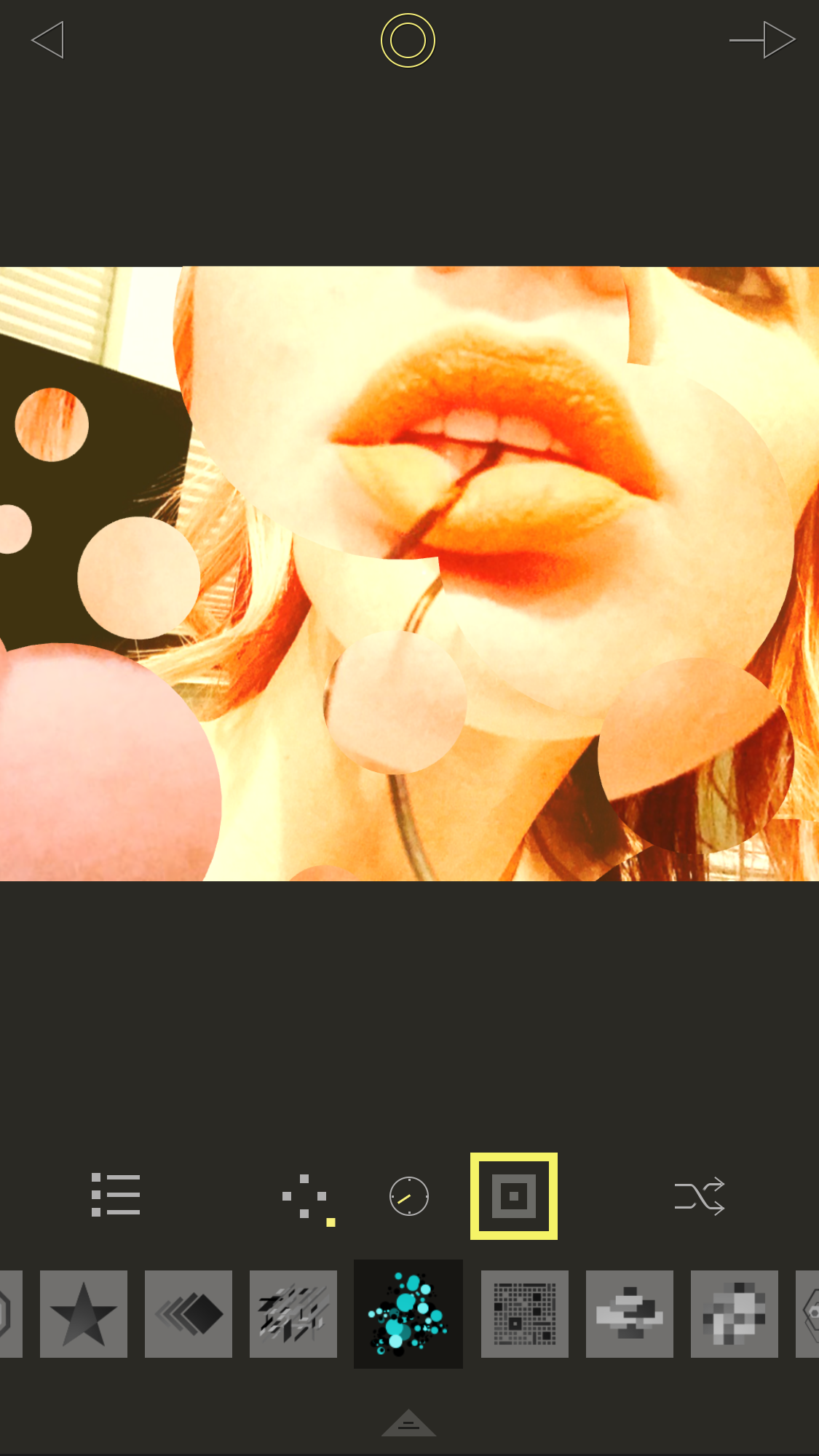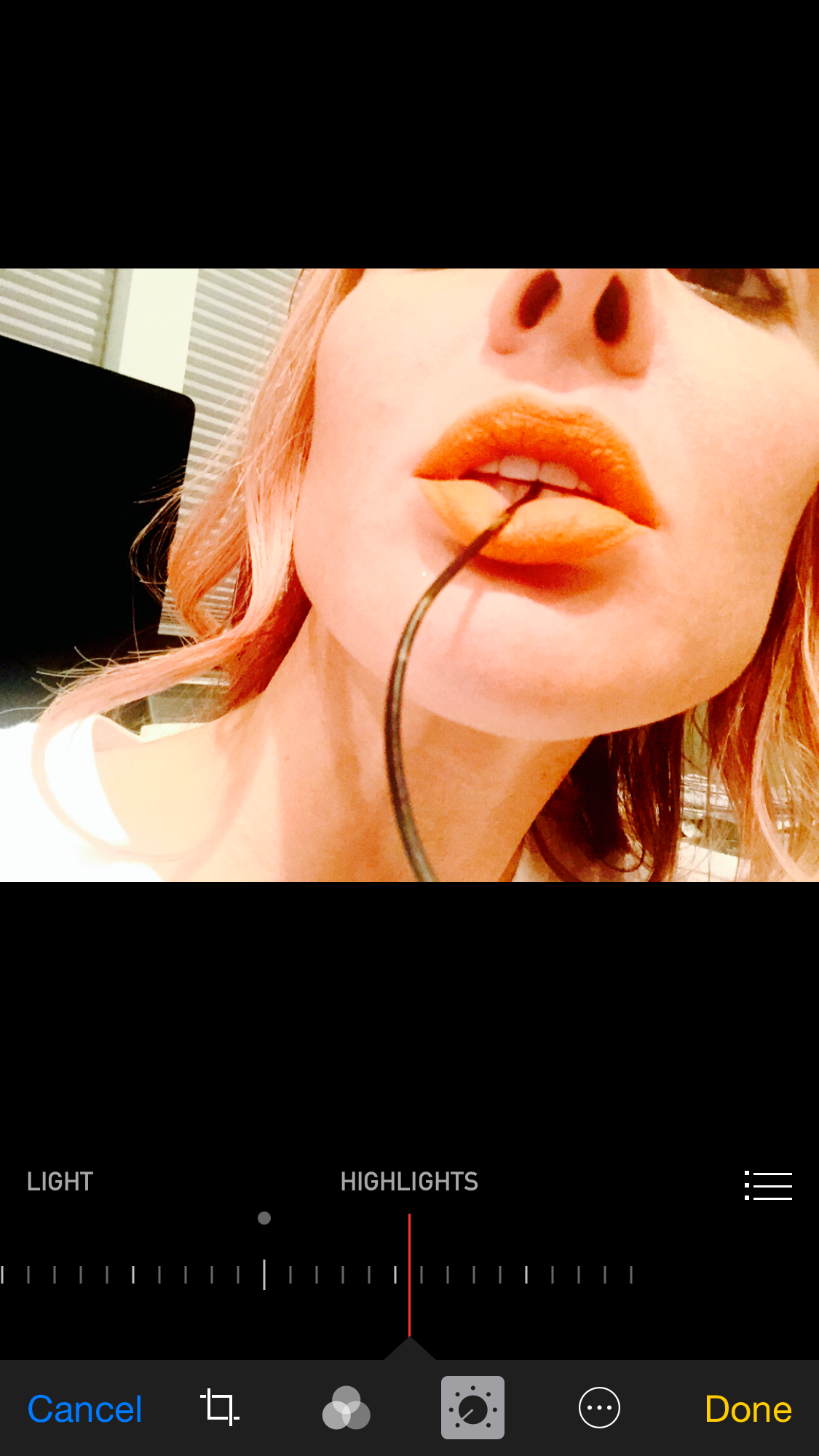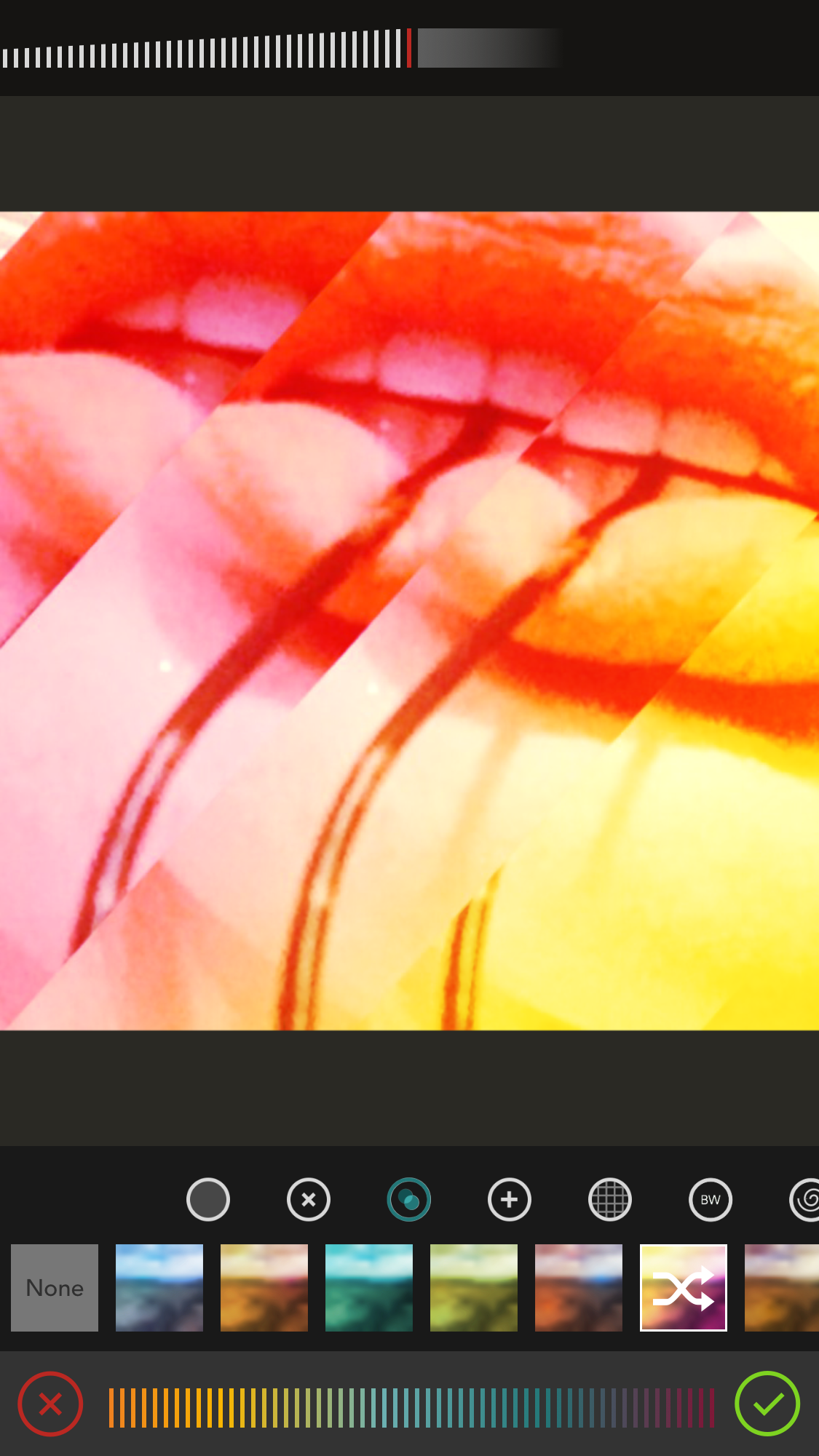 SHIFT is really great for altering color, creating inversions and adding style to your photos.  I chose this app for my image because I noticed that the lipstick I’m wearing in my selfie is really close in tone to everything else in the photo.  I felt it need a little color alteration to add interest.  When you open your saved image in the SHIFT app you will see the option to crop your image.  I know that I will be posting my photo to INSTAGRAM, so much of the time I will opt for a 1:1 ratio…. which means “square”.  SHIFT’s preset filters can be really easy, but for this image, I tapped the color feature located at the middle, bottom of the screen.  I opted for the filter named “Antigua”.  The filters are the colored boxes.  The circles above the colored boxes use a similar language to Photoshop.  You can alter the effect of the filter with these circles.  I chose “Overlay”.  The scale at the bottom alters hue and the scale at the top alters intensity.  TECH TIP…. tap the intersecting arrows on your color filter to change the position of your colors.  This app is cumulative, so I find that one selection looks better than layers of filters.  Click “DONE” and the image will save to your camera roll.