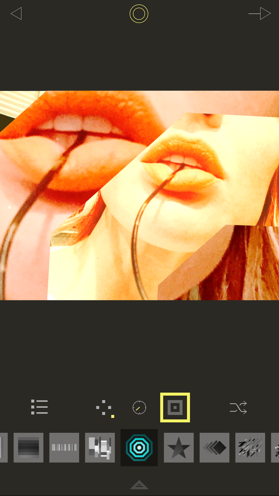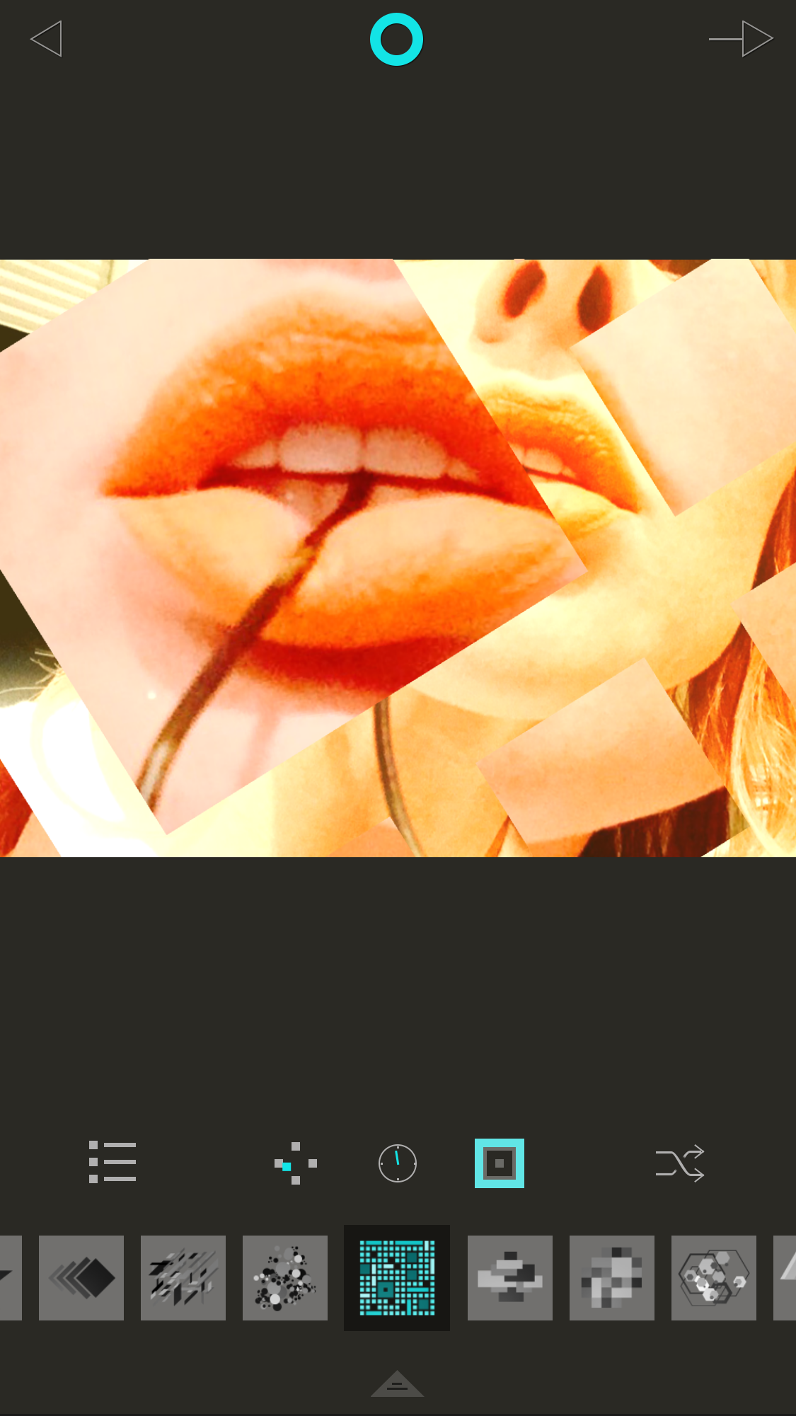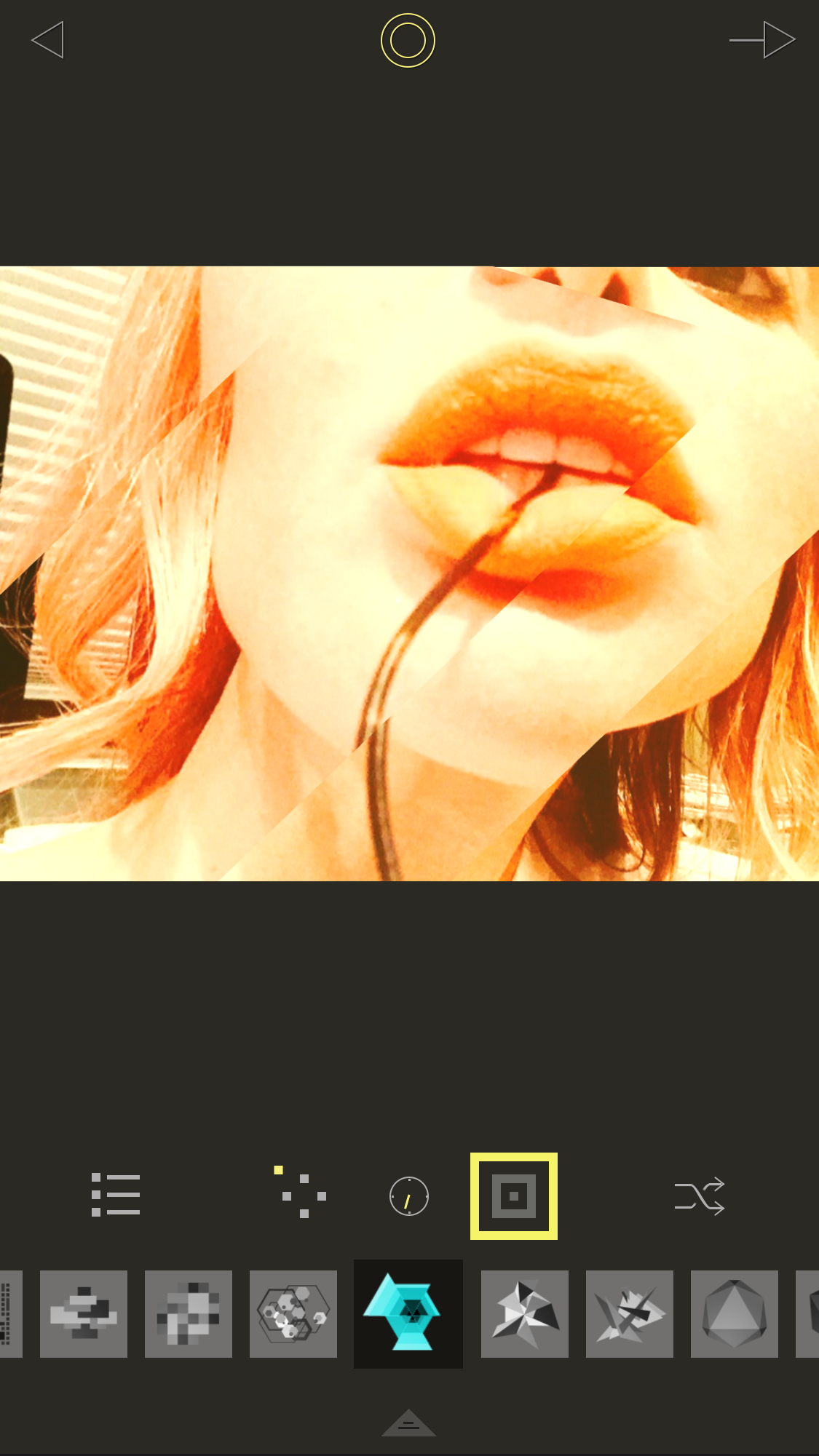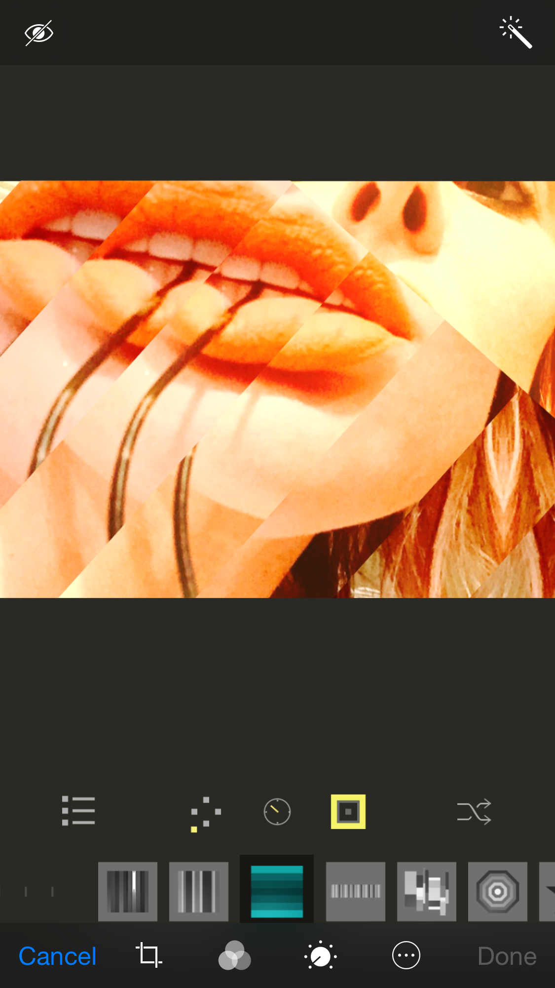 After saving the last frame, I open FRAGMENT.  I upload my saved image and use the various controls to find my desired fragmented edit.  TECH TIP… the circle at the top middle of the screen will bounce between editing the image versus the fragment.  If you don’t like the style of the fragment, click the two intersecting arrows on the right to get a new style.  I have noticed that uploading un-cropped images work best in this app.  FRAGMENT takes a little practice, but once you get the hang of it… so worth it.  The next series of images are variations I went through before finding the fragment I liked best.  Save your work to your camera roll and you’re ready to move on.